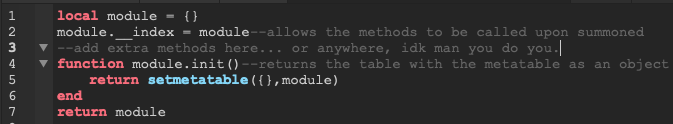 So far i’ve gone briefly over the building block of what i use to create objects, now it’s time for some juicy code. This here is an example of an empty Modulescript already set-up to have objects created off of it: